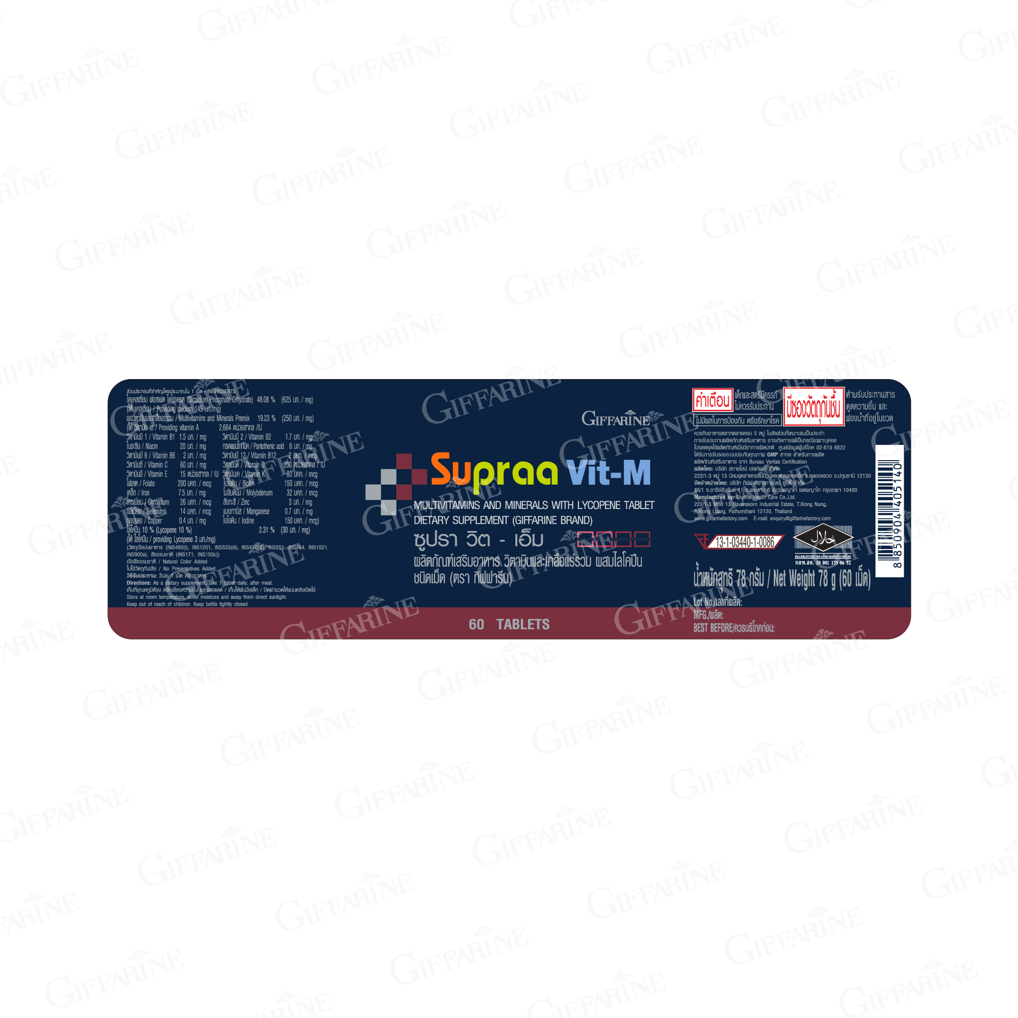 ผลิตภัณฑ์เสริมอาหารวิตามิน และเกลือแร่รวมผสมไลโคปีน ชนิดเม็ด ตรา กิฟฟารีน
