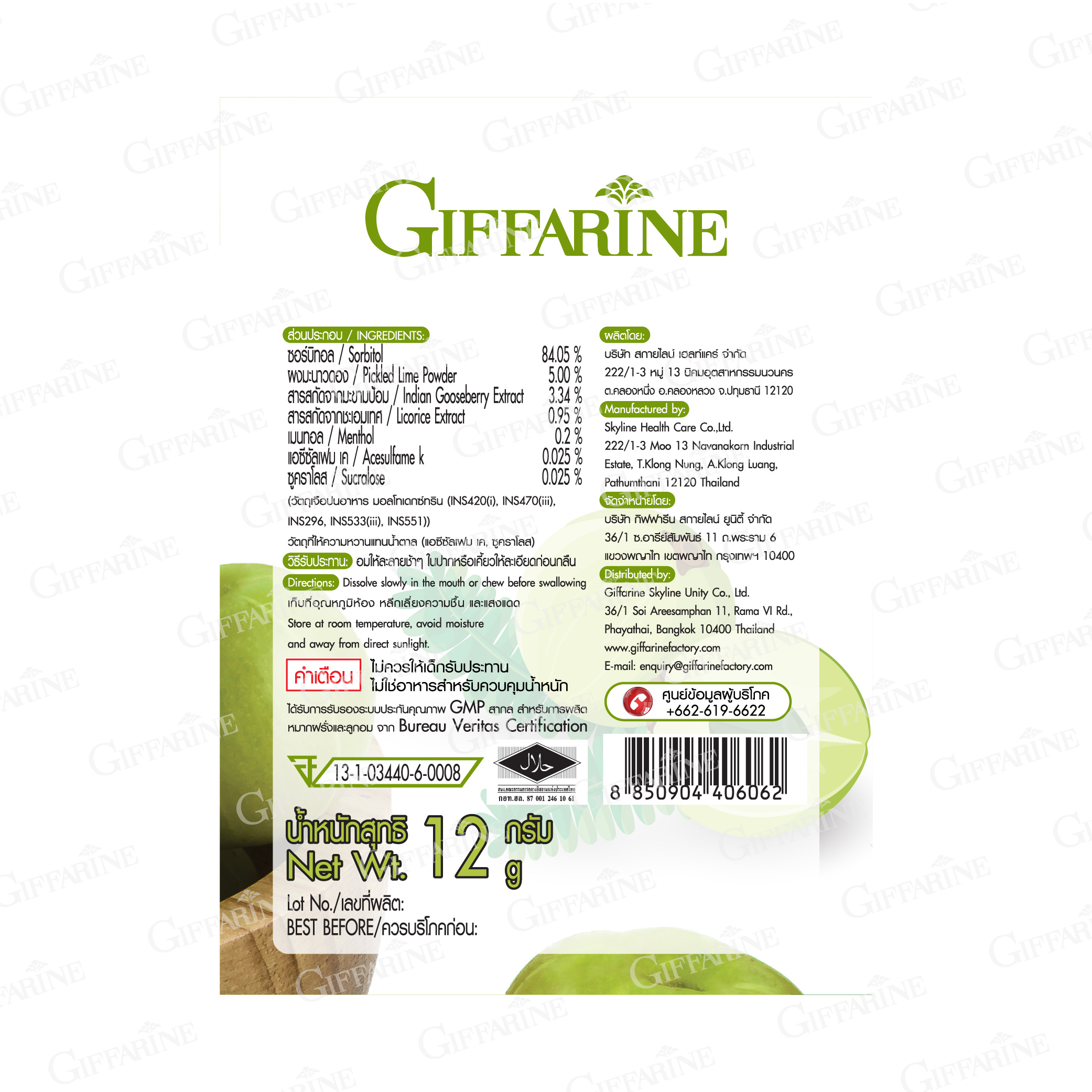 ส่วนประกอบที่สำคัญโดยประมาณ 1 แคปซูล : ซอร์บิทอล 504.30 มก. ผงมะนาวดอง 30.00 มก. สารสกัดจากมะขามป้อม 20.04 มก. สารสกัดจากชะเอมเทศ 5.70 มก. ใช้แอซีซัลเฟม เค และซูคราโลส เป็นวัตถุให้ความหวานแทนน้ำตาล คำเตือน :ไม่ควรให้เด็กรับประทาน และไม่ใช่อาหารควบคุมน้ำหนัก