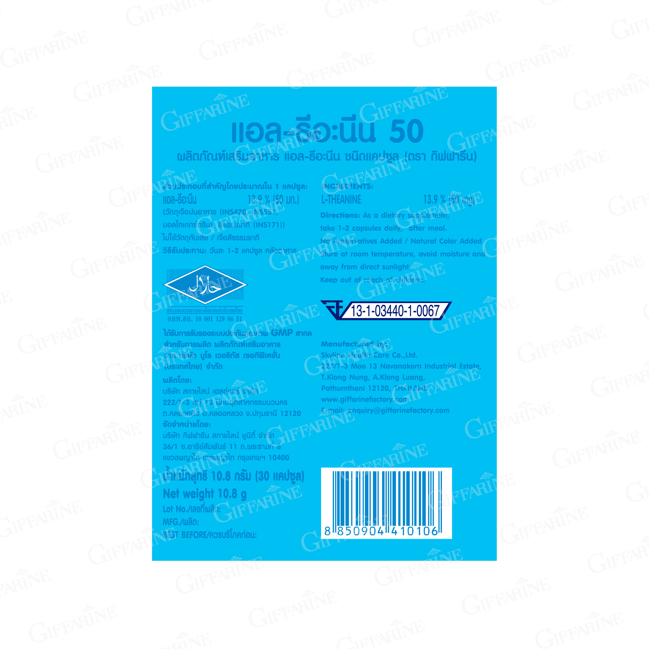 ส่วนประกอบที่สำคัญโดยประมาณใน 1 แคปซูล : แอล-ธี-อะนิน 50 มก.